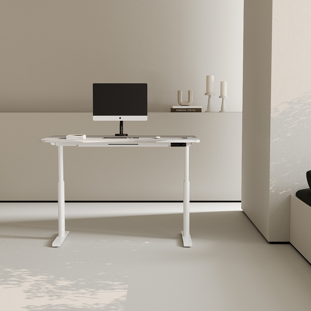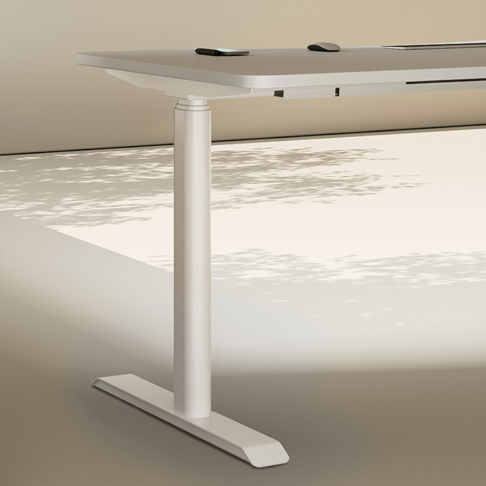 Biurko z elektryczną regulacją wysokości, panel sterowania z opcją zapamiętania 4 ustawień. Biały blat, regulowane nogi. Ergonomiczne biurko Kenoko.