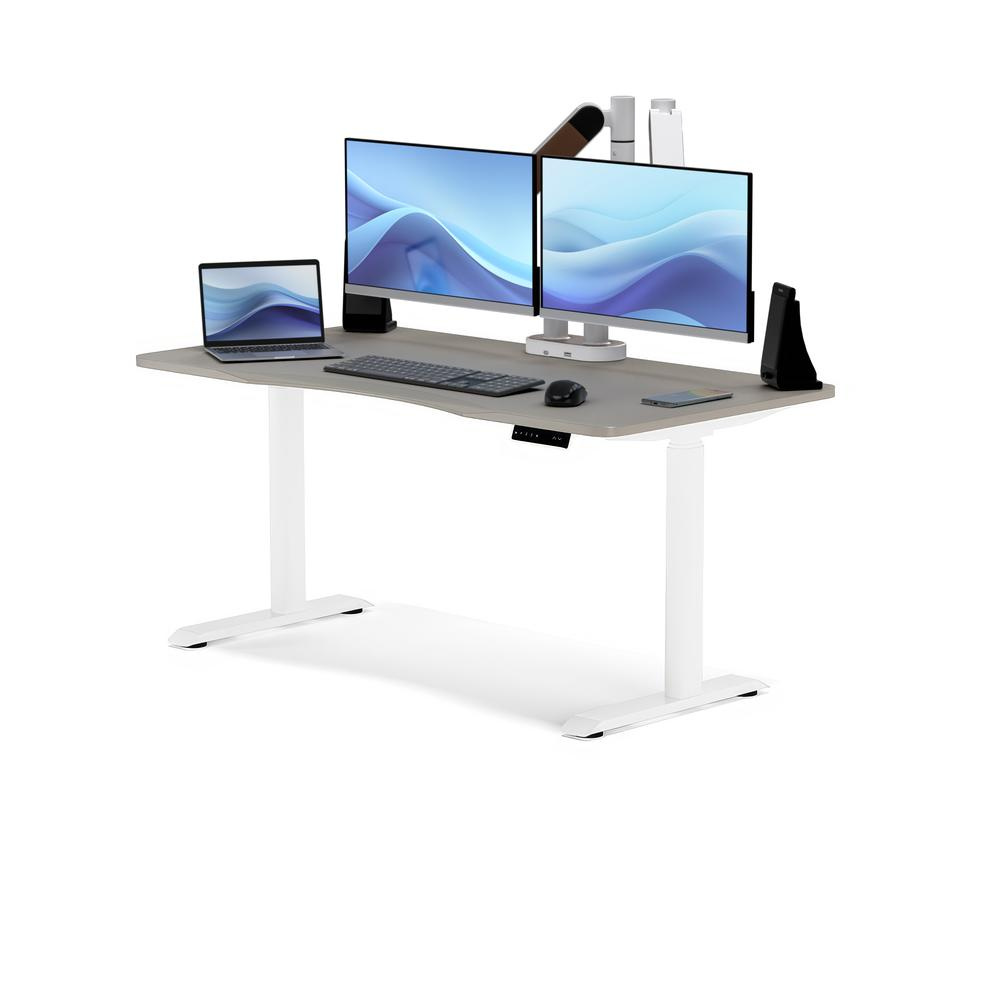 Monolityczny blat biurka Kenoko w kolorze białym i szarym, jednolita powierzchnia. Ergonomiczne stanowisko pracy z regulacją wysokości.