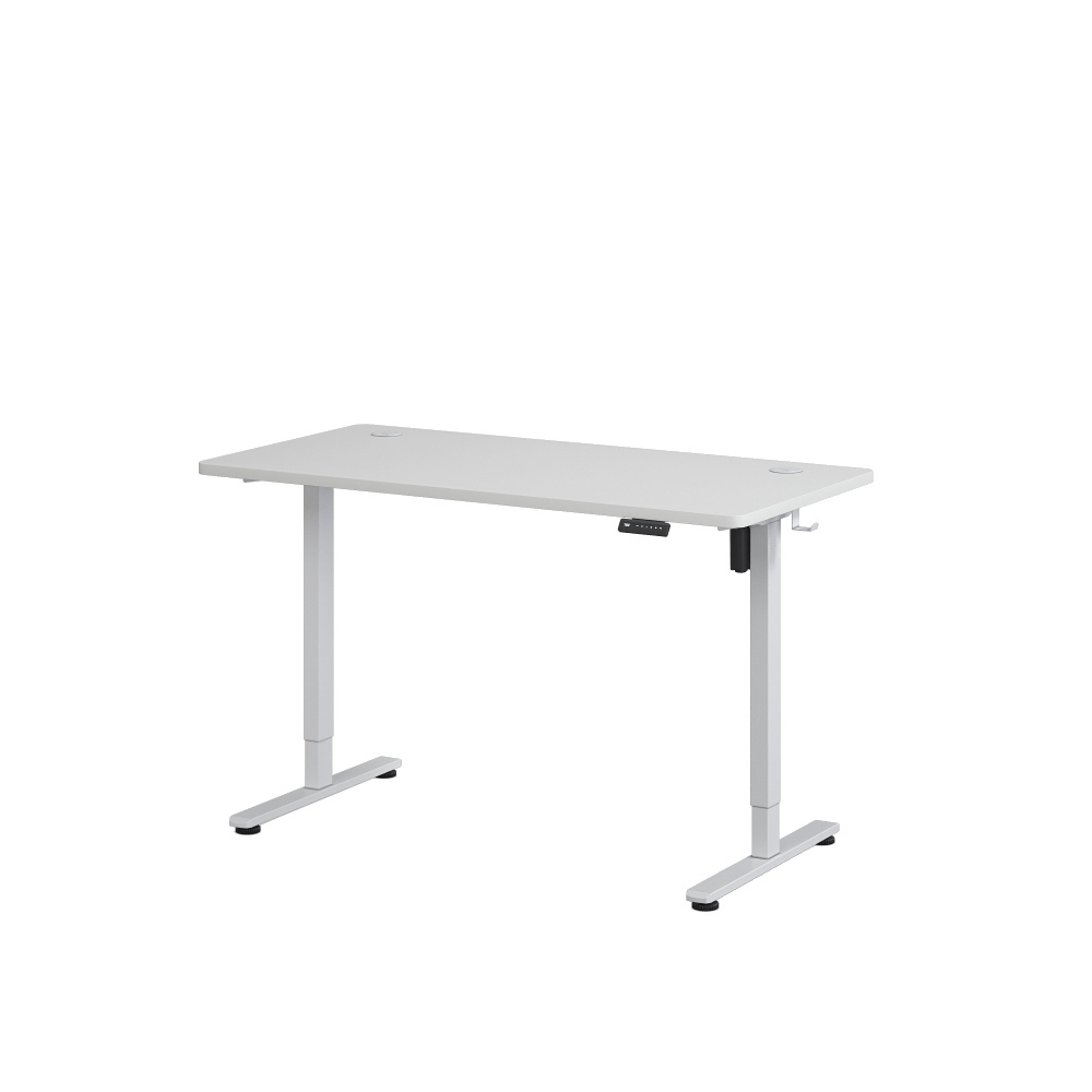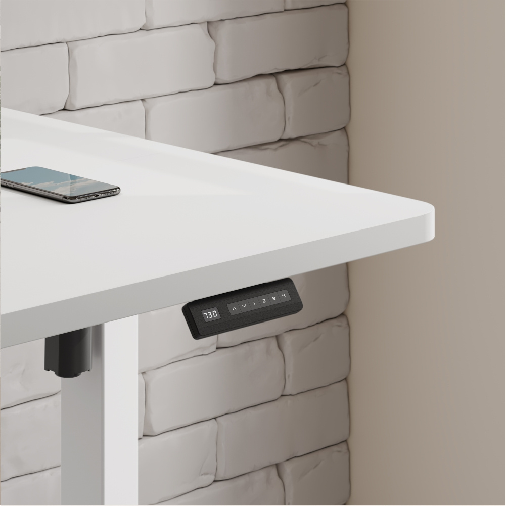 Biurko elektryczne IBUKI białe 160x80 cm posiada blat z laminowanej płyty wiórowej o grubości 15 mm, który jest zbudowany z dwóch części. Jego trwała konstrukcja podnosi odporność na codzienne użytkowanie. Na uwagę zasługują też zintegrowane przelotki na kable, które są umieszczone w narożnikach. Ich obecność pozwala na łatwe zagospodarowanie przewodów, co podnosi porządek i estetykę stanowiska pracy. Biała kolorystyka sprawia, że produkt świetnie pasuje do różnych aranżacji.