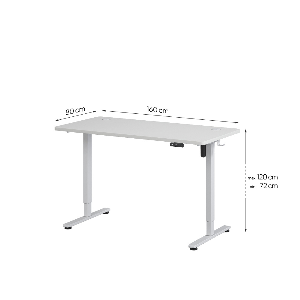 Wymiary w przypadku tego modelu wynoszą 160x80 cm, co zapewnia optymalną przestrzeń roboczą. W zestawie z biurkiem znajdują się 2 uchwyty na słuchawki, a także kółka podnoszące mobilność. Na uwagę zasługuje również maskownica na kable, która pomaga w utrzymywaniu uporządkowanego miejsca roboczego. Biurko pozwala na regulację wysokości w zakresie 72-120 cm bez kółek, dzięki czemu może być dostosowane do potrzeb wielu użytkowników. Obciążenie maksymalne wynosi 70 kg. Produkt jest objęty gwarancją przez dwa lata, a także posiada certyfikat jakości CE. Silnik 22 mm/s pracuje cicho i wydajnie.