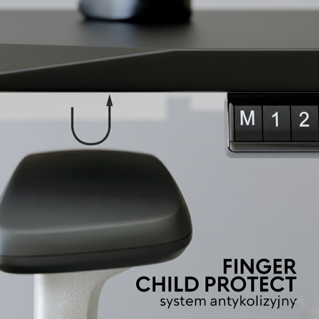 Mechanizm regulacji jest całkowicie bezpieczny. System antykolizyjny FINGER/CHILD PROTECT wstrzyma opadanie blatu, jeśli czujniki wykryją przeszkodę. W panelu znajdują się także porty USB, dzięki czemu łatwo podłączysz swoje urządzenia i doładujesz telefon.