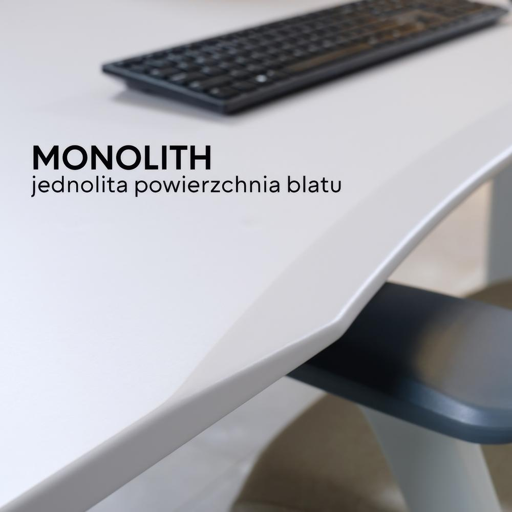 Monolityczny blat biurka Kenoko w kolorze białym i szarym, jednolita powierzchnia. Ergonomiczne stanowisko pracy z regulacją wysokości.