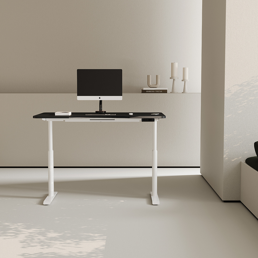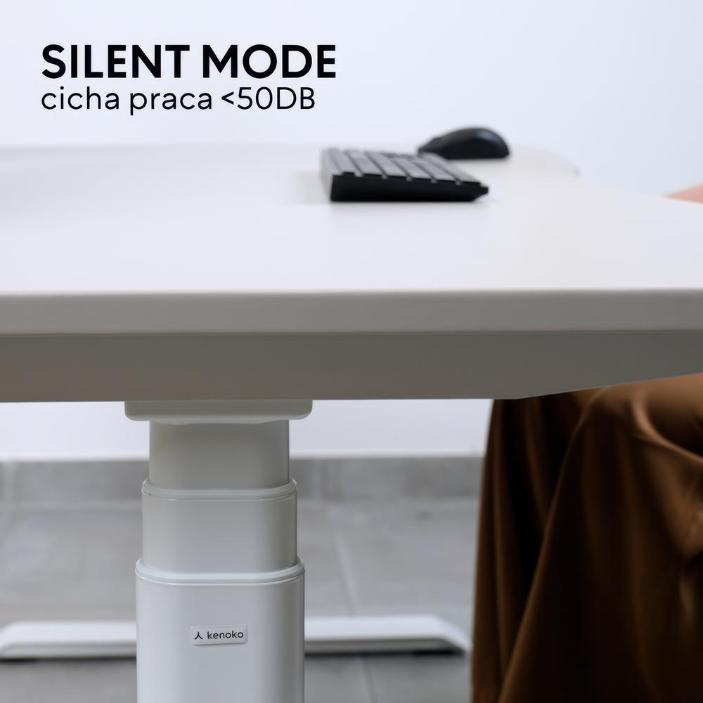 Biurko z elektryczną regulacją wysokości, panel sterowania z opcją zapamiętania 4 ustawień. Biały blat, regulowane nogi. Ergonomiczne biurko Kenoko.