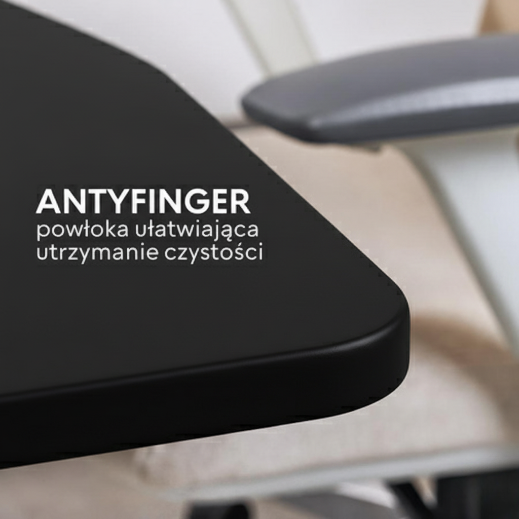 Ponadto, blat ma właściwości ANTYFINGER - materiał nie absorbuje płynów (wody lub tłuszczu). To gwarancja utrzymania biurka w czystości przez długi czas, bez plam czy śladów palców.
