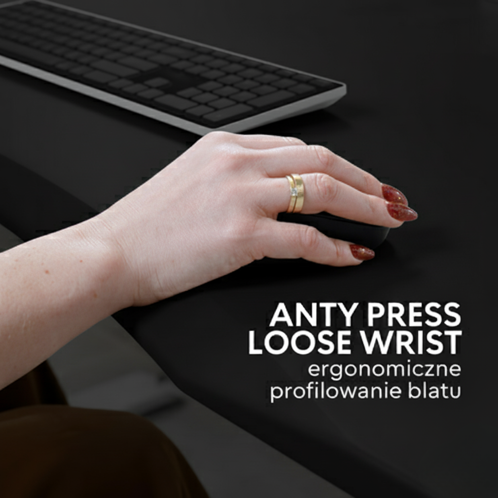 Przednia krawędź blatu została owalnie wyprofilowana, a także ukośnie ścięta by zmniejszać ucisk na nadgarstki. Przy 8-godzinnym pracy ma to niebagatelne znaczenie na uczucie zmęczenia dłoni i długoterminową profilaktykę (przeciwdziałanie zespołowi cieśni nadgarstka).