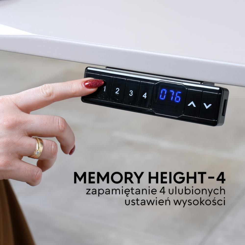 Wysokość blatu w biurku HIRA zmienia się jednym kliknięciem z poziomu panelu sterowania umieszczonego tuż pod blatem. Panel posiada także funkcję pamięci MEMORY HEIGHT-4 umożliwiająca zaprogramowanie aż 4 różnych pozycji. Dzięki temu szybko wrócisz do ulubionych ustawień, bez konieczności ponownego dostosowywania optymalnej wysokości blatu.