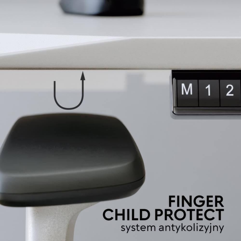 Mechanizm regulacji jest całkowicie bezpieczny. System antykolizyjny FINGER/CHILD PROTECT wstrzyma opadanie blatu, jeśli czujniki wykryją przeszkodę. W panelu znajdują się także porty USB, dzięki czemu łatwo podłączysz swoje urządzenia i doładujesz telefon.