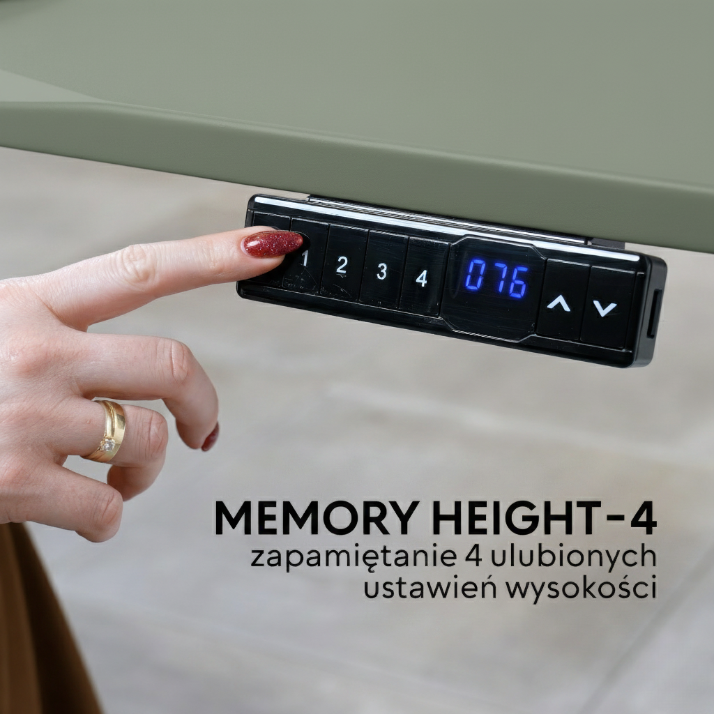 Wysokość blatu w biurku HIRA zmienia się jednym kliknięciem z poziomu panelu sterowania umieszczonego tuż pod blatem. Panel posiada także funkcję pamięci MEMORY HEIGHT-4 umożliwiająca zaprogramowanie aż 4 różnych pozycji. Dzięki temu szybko wrócisz do ulubionych ustawień, bez konieczności ponownego dostosowywania optymalnej wysokości blatu.