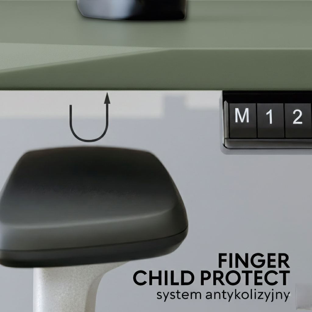 Mechanizm regulacji jest całkowicie bezpieczny. System antykolizyjny FINGER/CHILD PROTECT wstrzyma opadanie blatu, jeśli czujniki wykryją przeszkodę. W panelu znajdują się także porty USB, dzięki czemu łatwo podłączysz swoje urządzenia i doładujesz telefon.