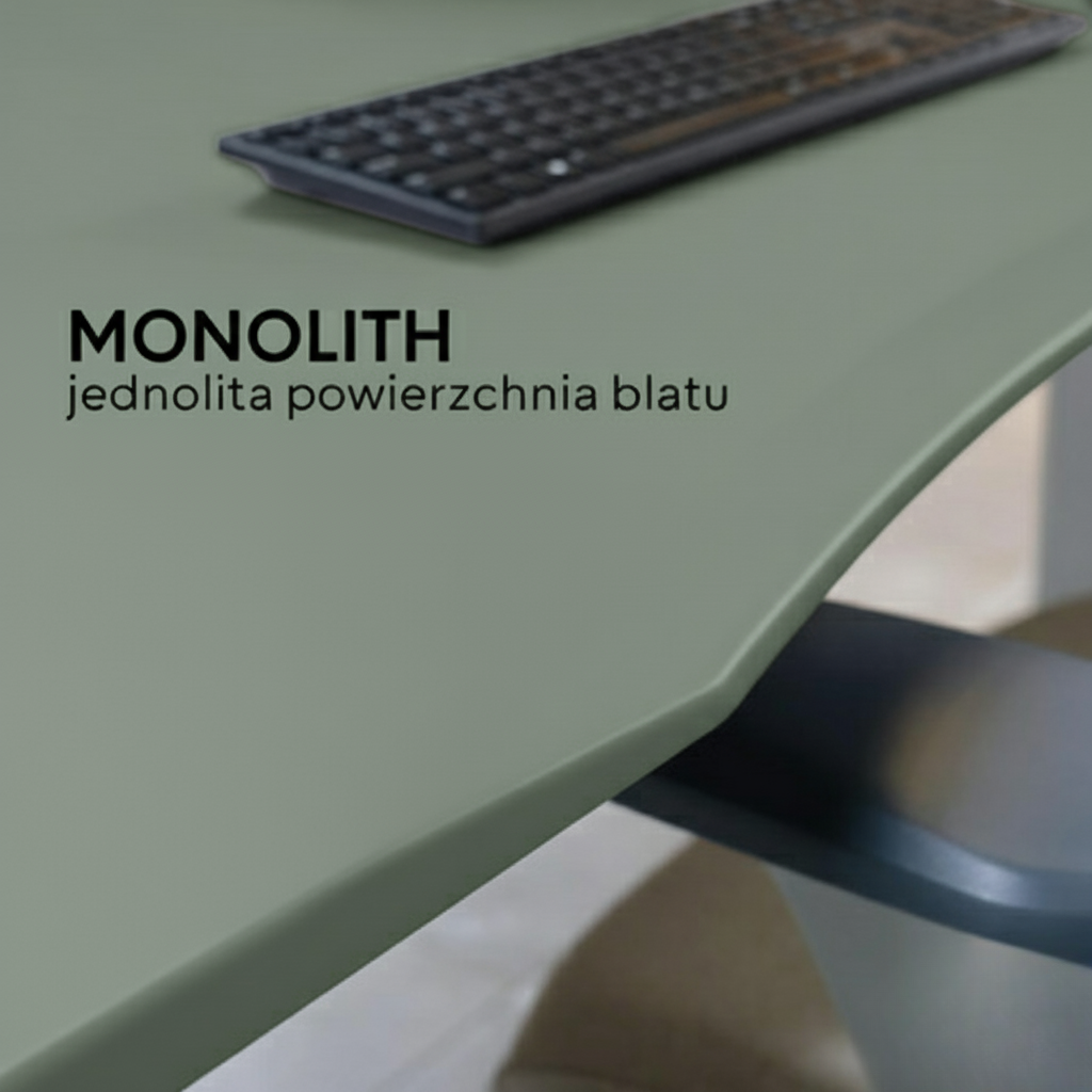Każdy blat biurka HIRA został zrobiony w technologii MONOLITH, która polega na jednolitym pokryciu blatu oraz nóg kolorem w technologii proszkowej, bez łączeń na krawędziach, które z czasem mogłyby zbierać brud lub rozklejać się.