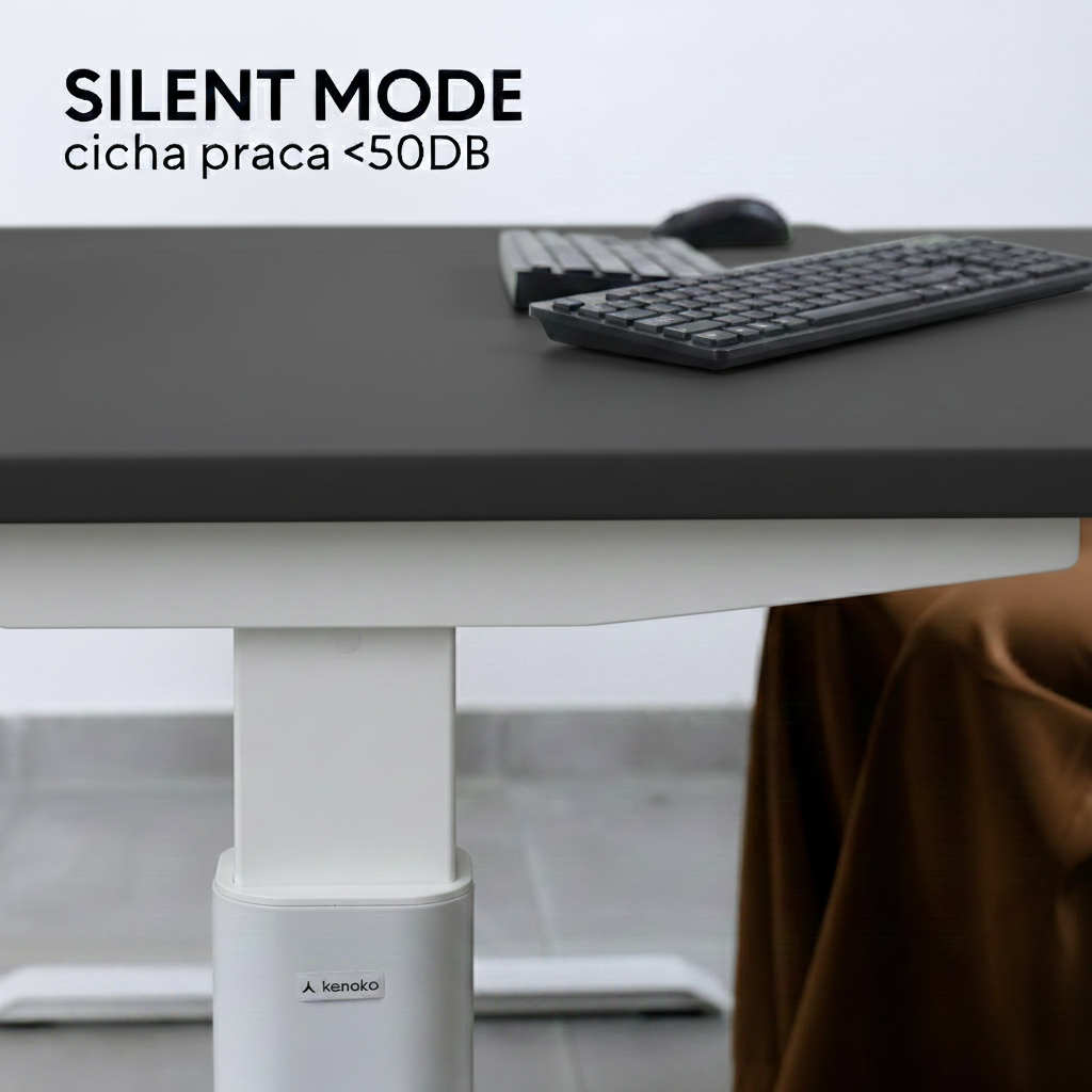 Monolityczny blat biurka Kenoko w kolorze białym i szarym, jednolita powierzchnia. Ergonomiczne stanowisko pracy z regulacją wysokości.