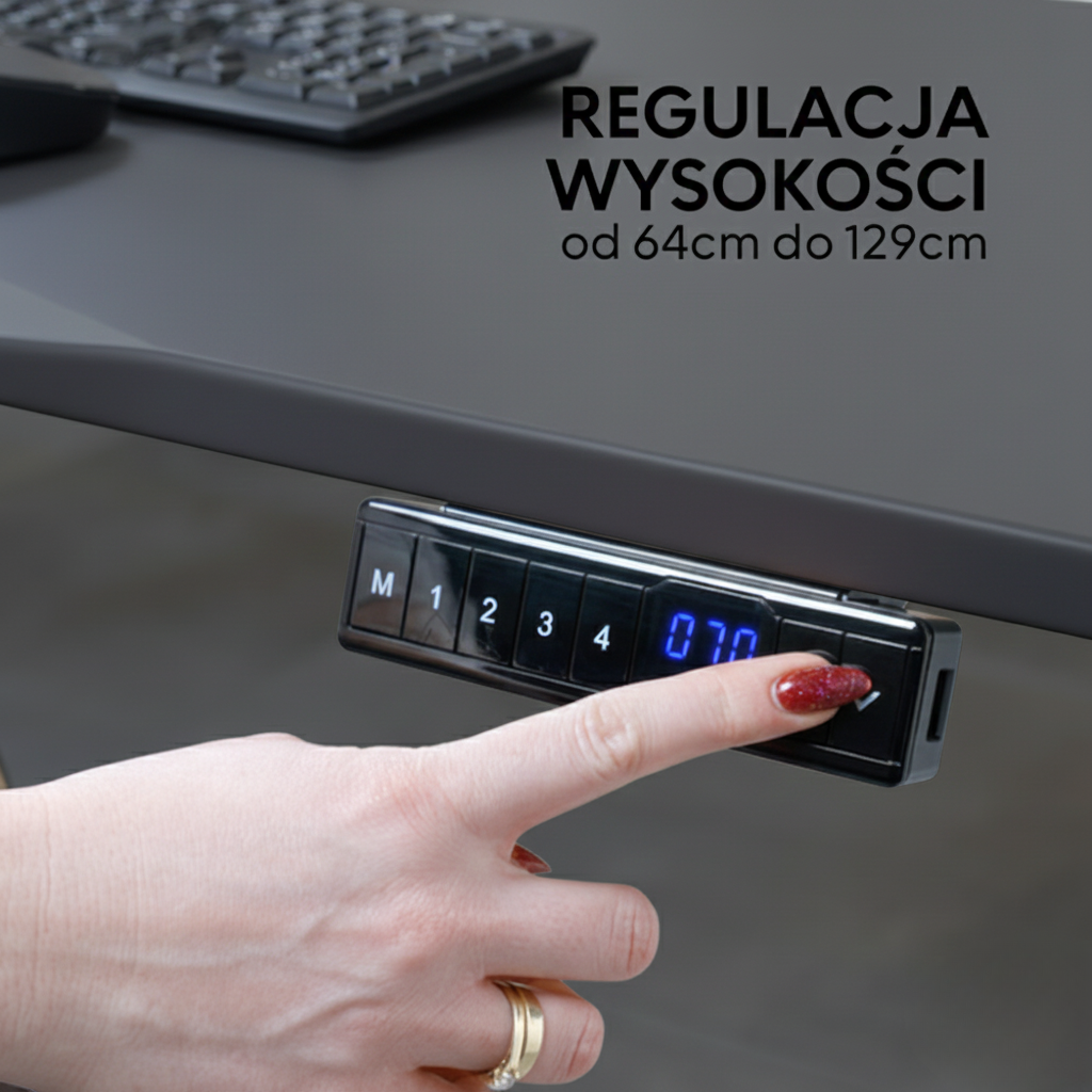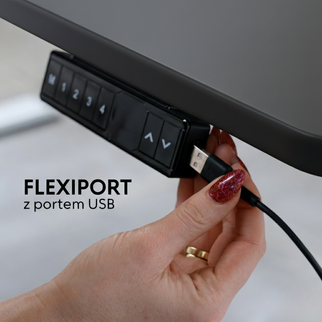 Mechanizm regulacji jest całkowicie bezpieczny. System antykolizyjny FINGER/CHILD PROTECT wstrzyma opadanie blatu, jeśli czujniki wykryją przeszkodę. W panelu znajdują się także porty USB, dzięki czemu łatwo podłączysz swoje urządzenia i doładujesz telefon.