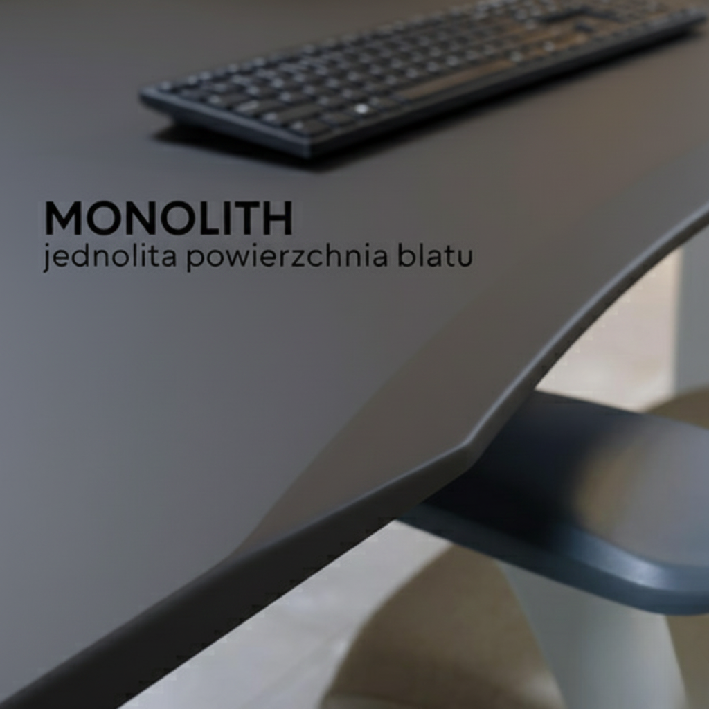 Każdy blat biurka HIRA został zrobiony w technologii MONOLITH, która polega na jednolitym pokryciu blatu oraz nóg kolorem w technologii proszkowej, bez łączeń na krawędziach, które z czasem mogłyby zbierać brud lub rozklejać się.