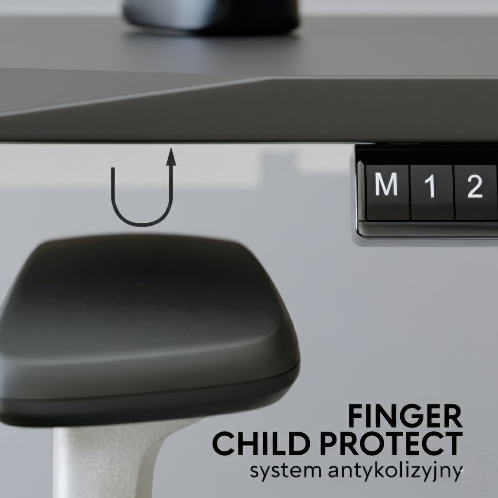 Mechanizm regulacji jest całkowicie bezpieczny. System antykolizyjny FINGER/CHILD PROTECT wstrzyma opadanie blatu, jeśli czujniki wykryją przeszkodę. W panelu znajdują się także porty USB, dzięki czemu łatwo podłączysz swoje urządzenia i doładujesz telefon.
