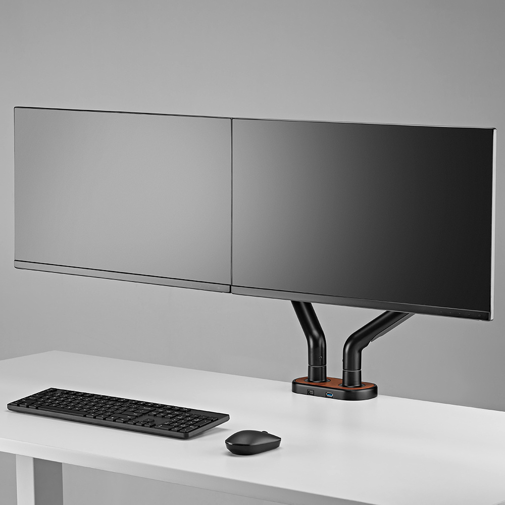 Podwójny uchwyt do monitora 17-35 cali czarny/brąz WASHI to produkt zgodny z systemami VESA 100 x 100 mm i 75 x 75 mm. Oferowany model jest dzięki temu bardzo uniwersalny, ponieważ obsługuje większość urządzeń dostępnych na rynku. Dopuszczalne obciążenie na jeden monitor sięga aż 11 kg. Mechanizm sprężynowy uchwytu WASHI gwarantuje sprawną regulację w dowolnej płaszczyźnie, pionowo, poziomo i pod względem nachylenia. Monitory mogą być dzięki temu optymalnie ustawione, co redukuje obciążenie kręgosłupa i karku przy długotrwałej pracy.